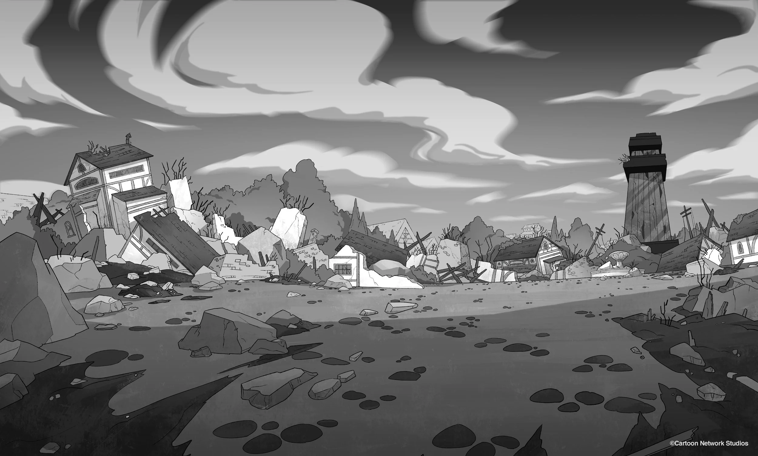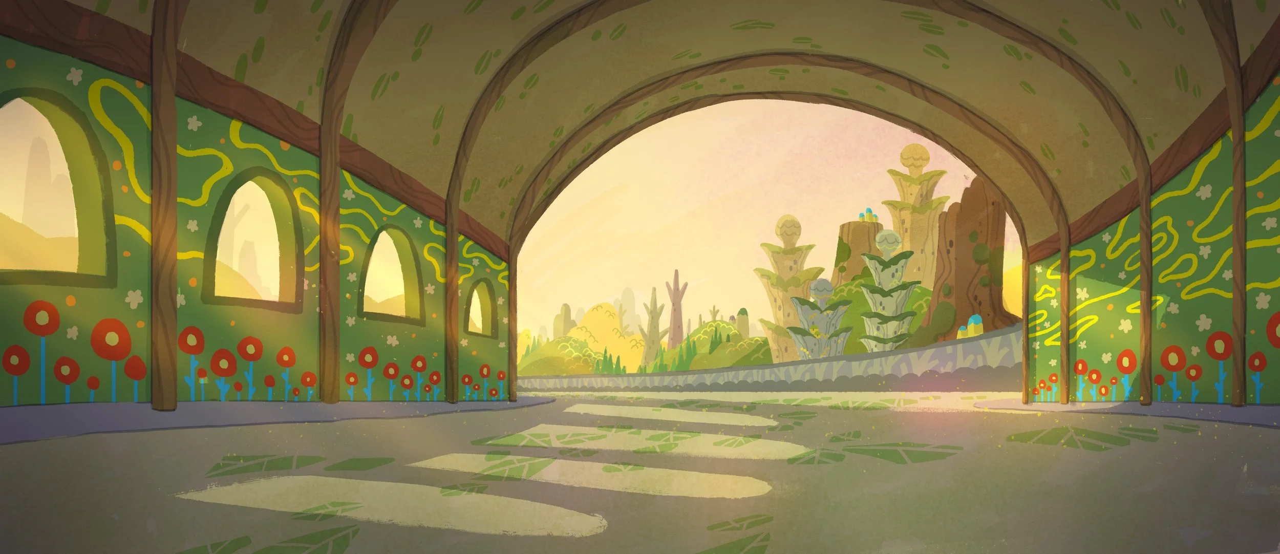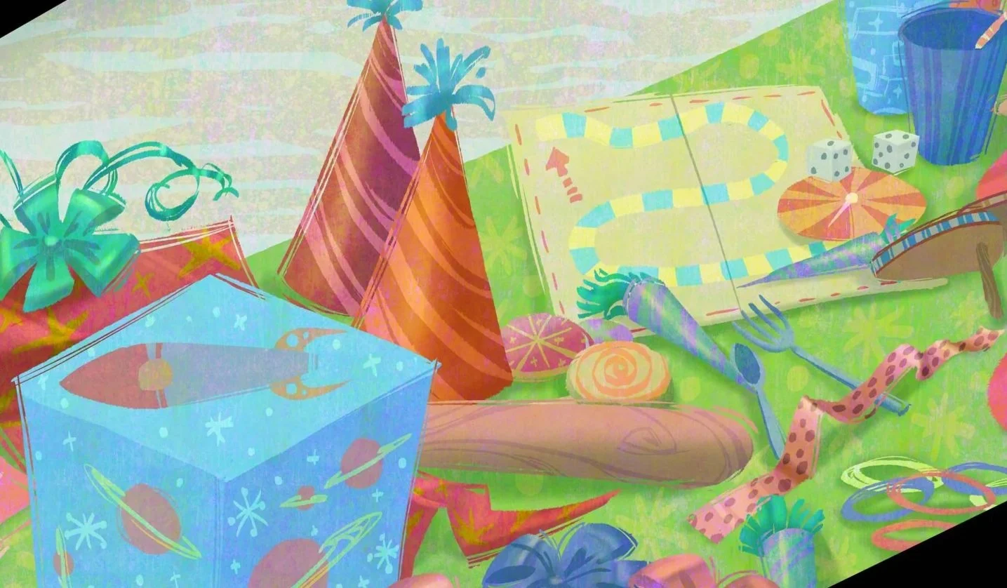 Designed and painted backgrounds in line and color for Wolfboy and the Everything Factory, produced by Bento Box Entertainment for Apple TV+ and art directed by Beatrice Blue. Set within the magical world of the Everything Factory, the series moved through distinct “elemental zones,” each governed by its own visual logic. Environments were designed with unique shape language, color schemes, and design motifs that embodied the physical and emotional qualities of each element.